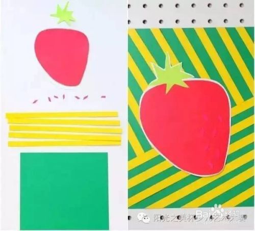 在绿色卡纸上,贴上黄色的卡纸条,注意哦,不要全部横着贴,斜着贴也很好看哦~