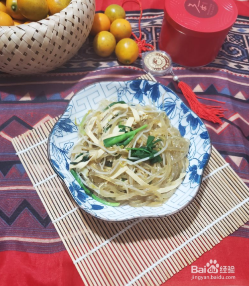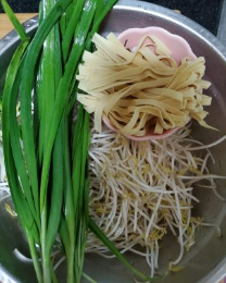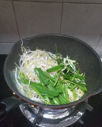 下韭菜,绿豆芽,豆皮翻炒一会软了。