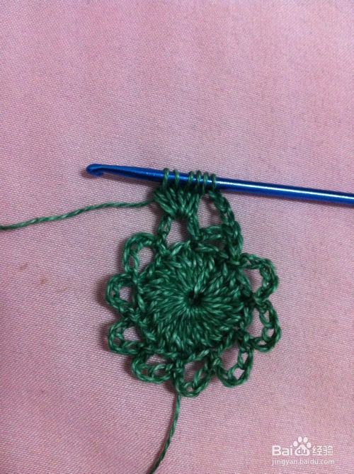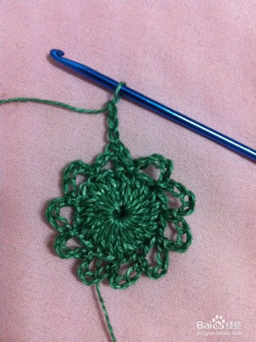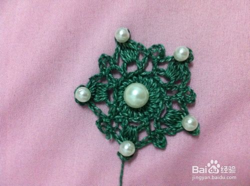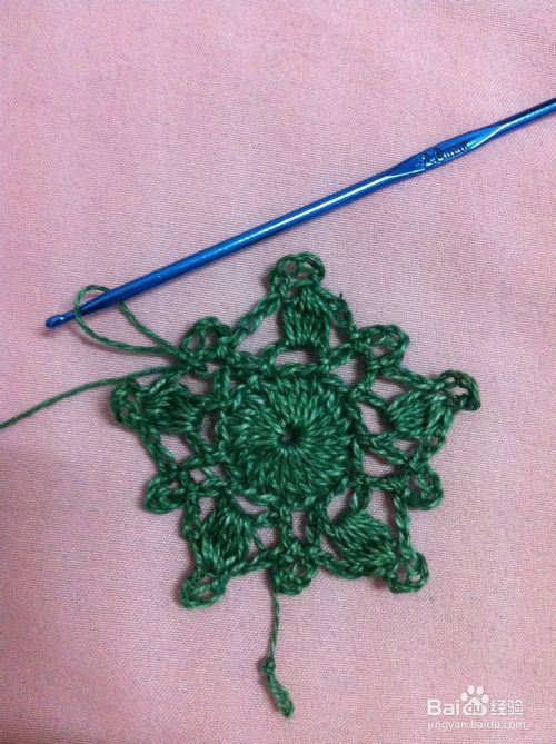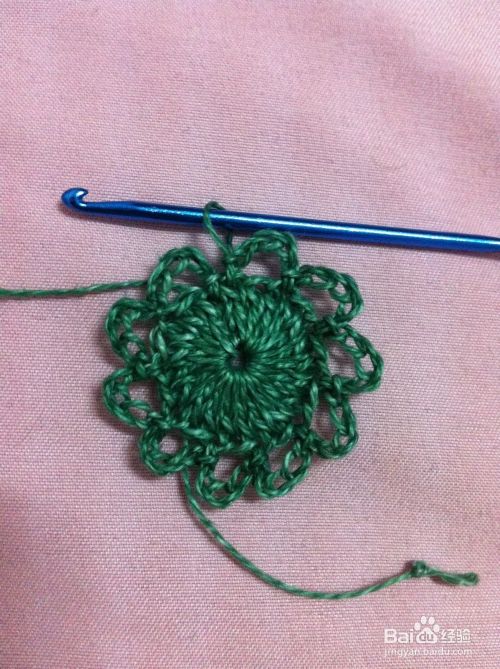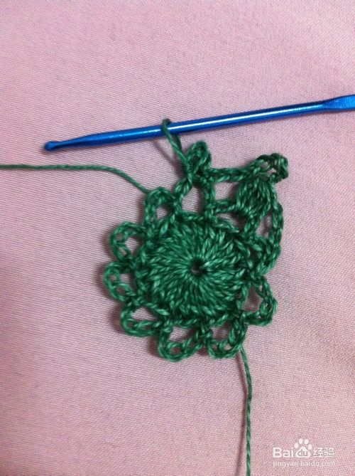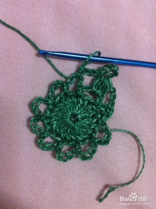 在第二个花边圈里钩中长针4针,最后雨第4步骤拉花收尾1针