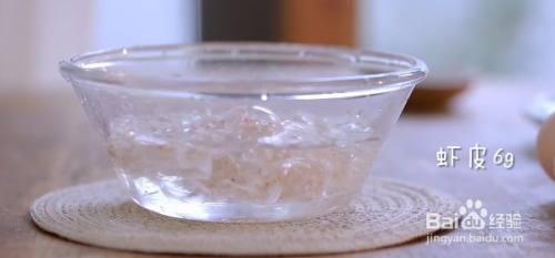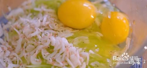 碗中加添面粉,虾皮和盐,打入2个鸡蛋,搅拌匀。