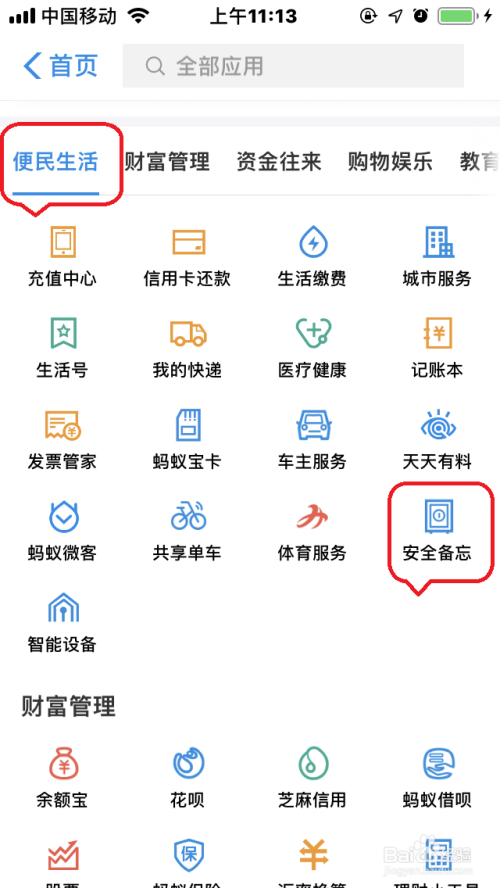 点击首页“更多——便民生活”,找到并点击“安全备忘”。