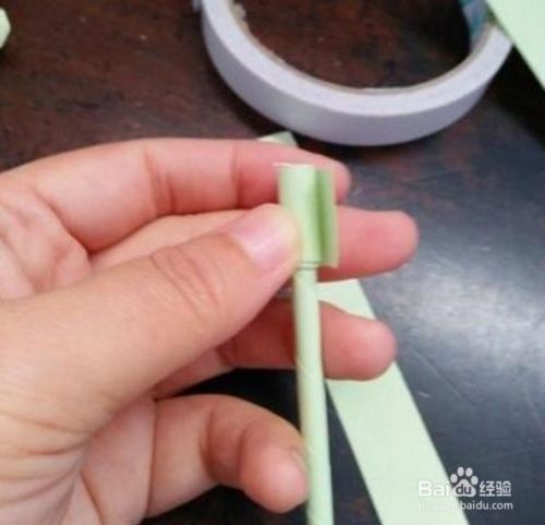 粘好后如图,我们开始做伞把,用长方形的纸卷成长条,把外边缘粘住。