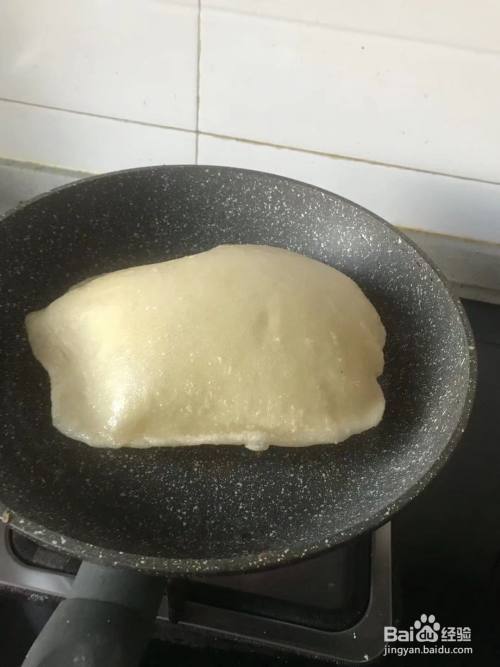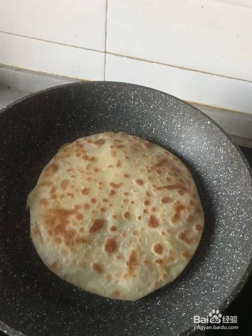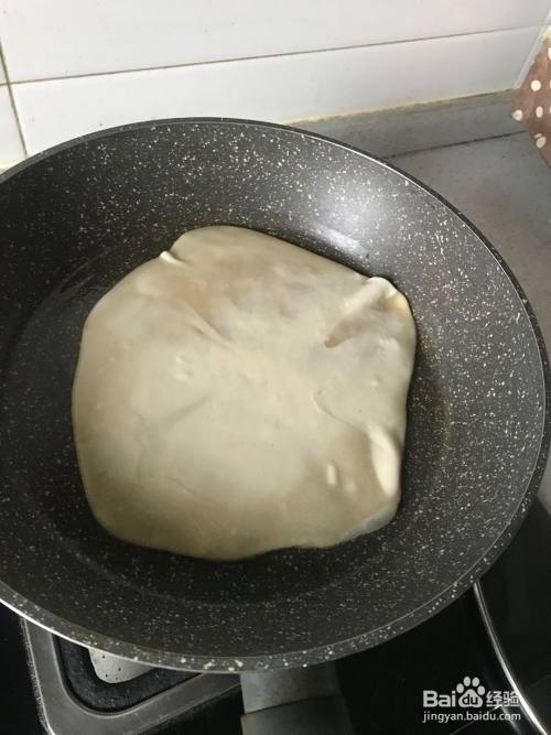 第9步,平顶锅加一点油,大火加热,关小火,把面团轻轻的擀成薄薄的饼,一定要轻一点,不能擀破。然后放入锅里,30秒的样子翻面,稍微开大一点的火煎。
