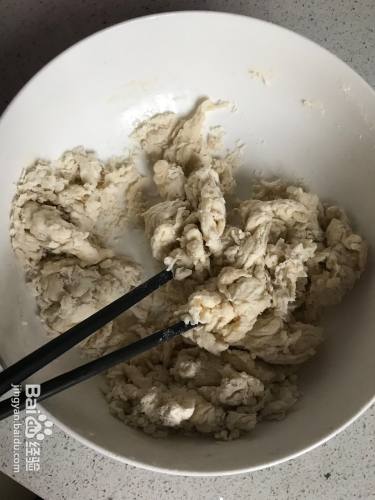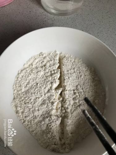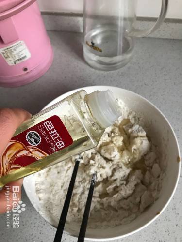 第2步,面粉中一半加开水搅拌,一半用温水搅拌,再加入3毫升的植物油或者色拉油都可以,搅拌成絮状。