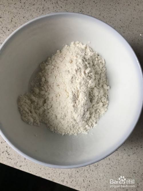 第1步,取一个大碗,倒入300克面粉,把面粉里加一点盐,拌均匀,然后把面粉分成两半。