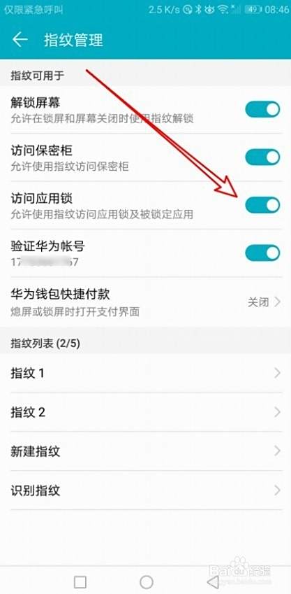 这时会打开指纹管理页面,找到访问应用锁的设置项。