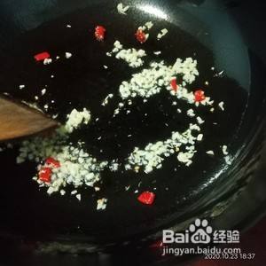 把锅里水倒掉,简单清洗一下锅子,上火烤干水分,倒油(油不必多,但建议整个锅壁都刷上),小火热油。 切好的蒜末小米椒下油锅爆香(建议用小火,不然蒜末容易焦黑)。