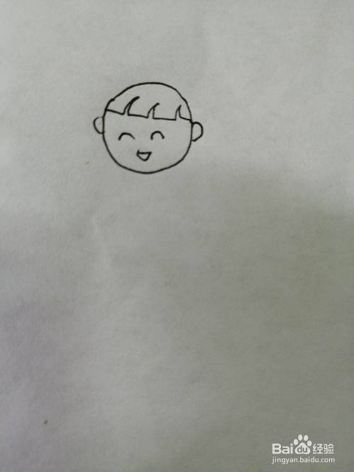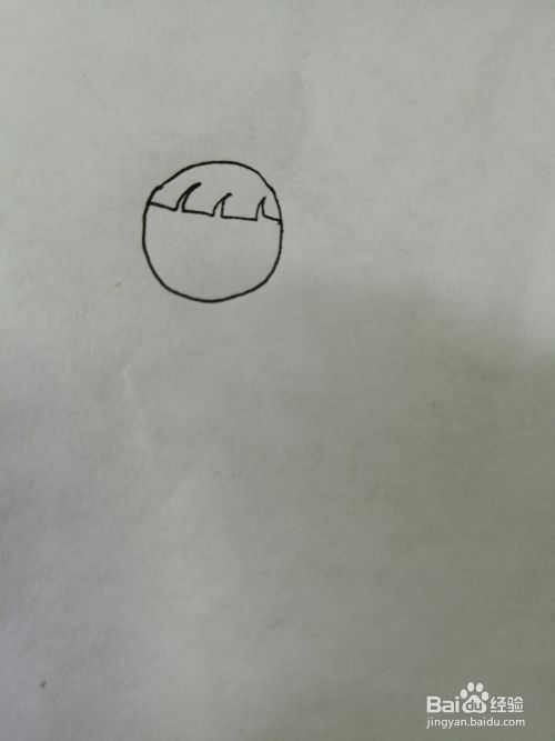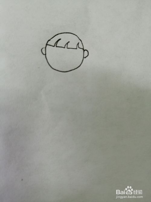 第二步,接着在头部里面画出一条波浪线的刘海和两个耳朵。