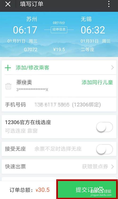 确认车票的订单信息。说明:一定要确认好乘坐的车次、日期、乘客姓名、手机号,确认无误后,点击“提交订单”。