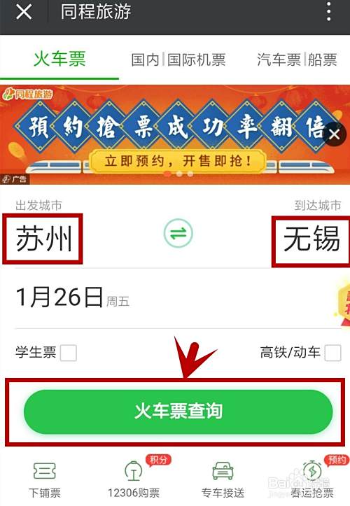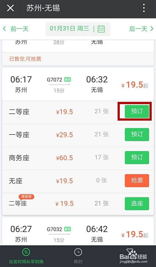 选择火车票的日期、时间,点击想购买的火车票,并点击“预订”。