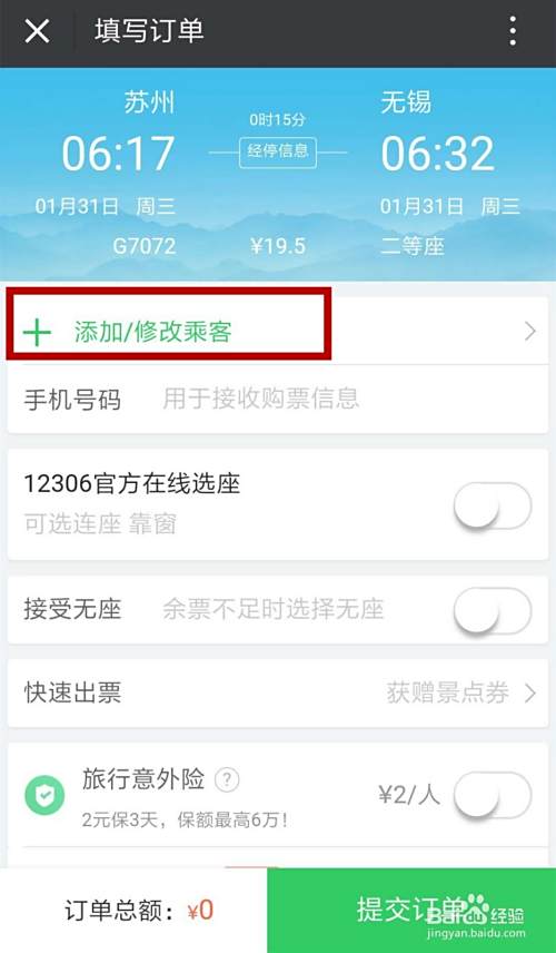 填写订单,点击“添加/修改乘客”,手机号码可输入,也可不输入,因为下面登录帐户后会自动提取;输入目的:用于接收购票信息。
