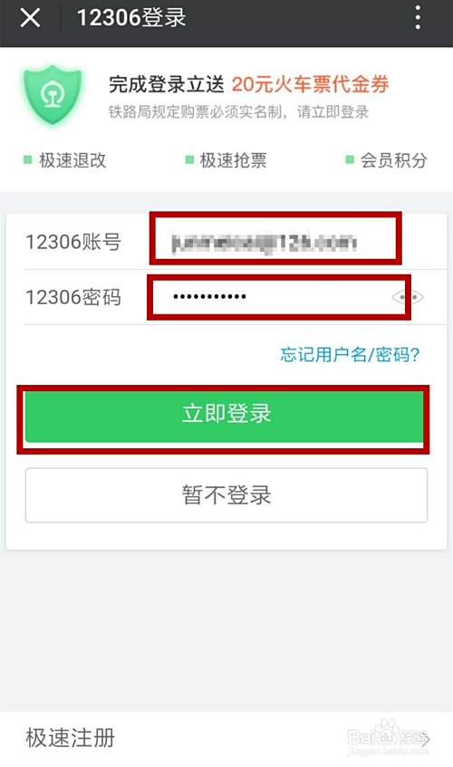 说明:登录名可为用户名、邮箱、手机号,如果没有帐号和密码,可到12306官网先注册一个。
