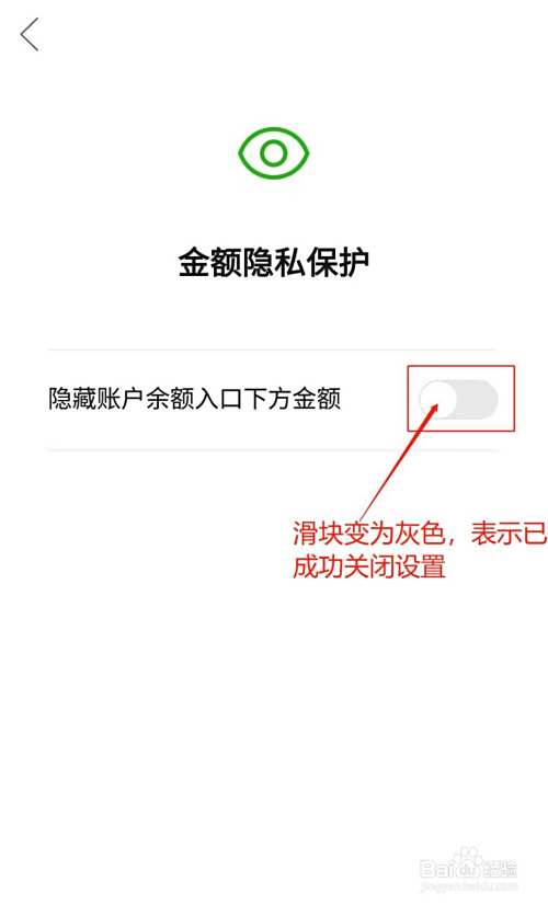 “隐藏账户余额入口下方金额”选项后方滑块变为灰色,表示已成功关闭设置;