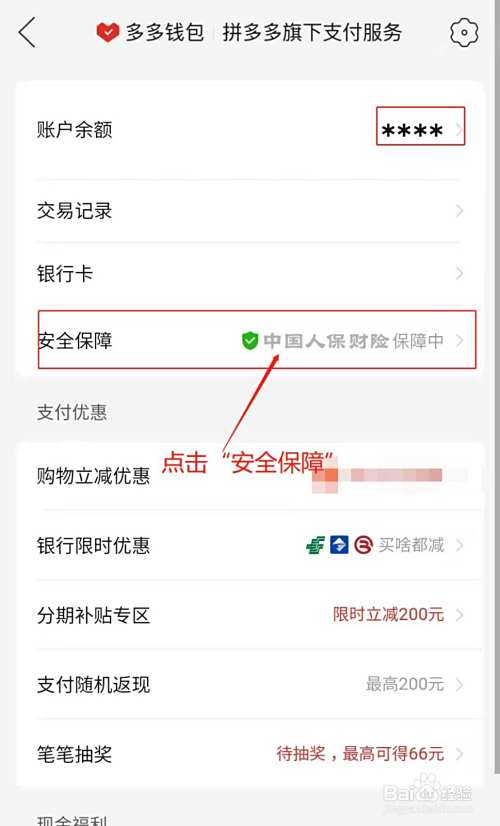 打开我的多多钱包,账户余额以*显示,点击“安全保障”;