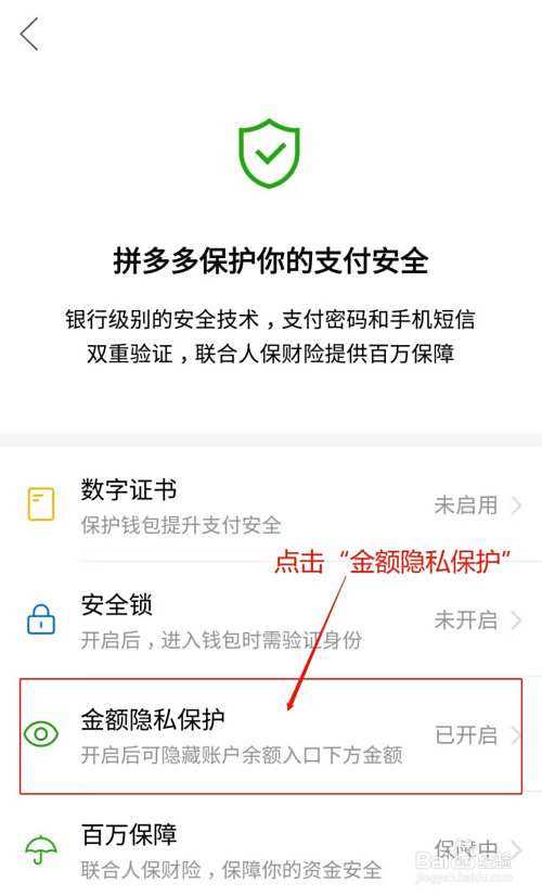 弹出安全保障设置列表,点击“金额隐私保护”;