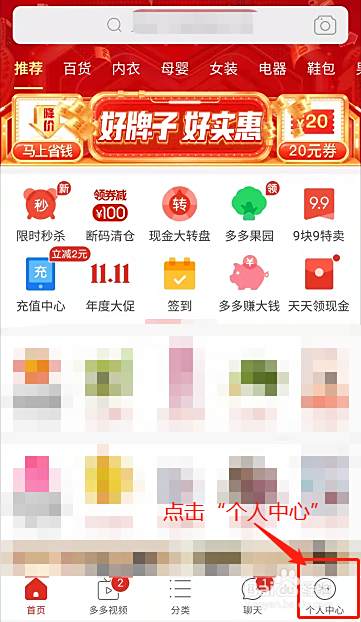打开拼多多APP,点击“个人中心”;