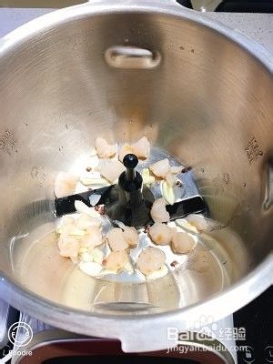 机器人搅拌桶内放入炒菜刀头,放入玉米油、蒜片、扇贝丁。