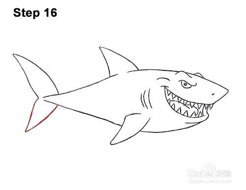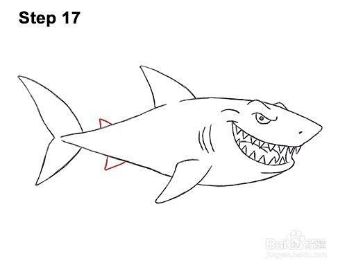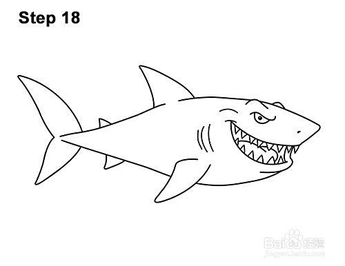 第18步:使用钢笔或记号笔,小心翼翼地走过线路,使您的卡通鲨鱼画永久。上墨后,用橡皮擦去掉每个铅笔标记。