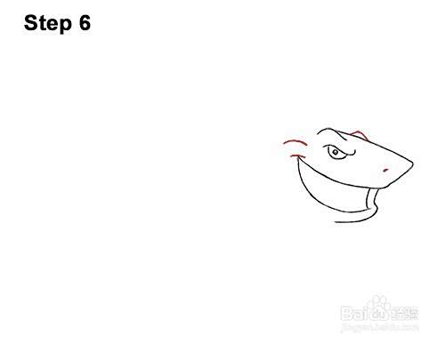 第六步:在嘴的左上方画几条曲线,强调卡通鲨鱼的笑容。在头部的右上方添加一条短曲线,在另一侧的眉毛上。在鼻孔上方,靠近鼻尖,为鼻孔画一个小狭缝。