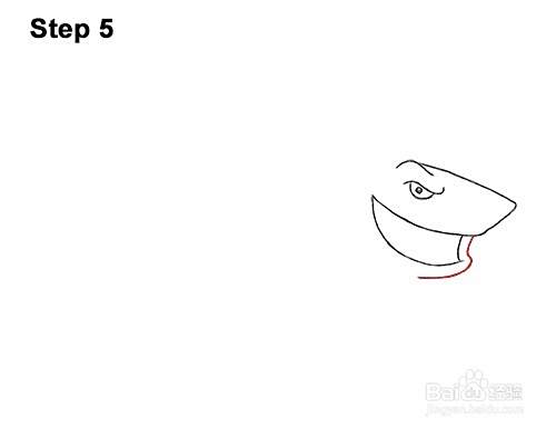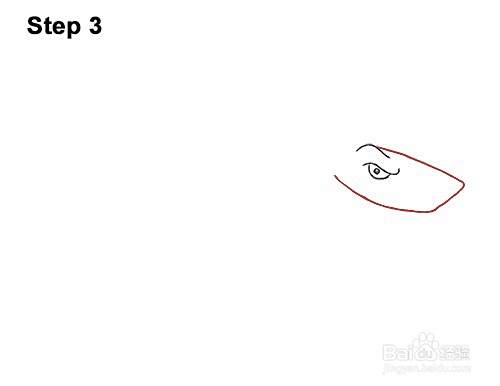 第3步:先画一条斜线到眼睛右侧,画出鲨鱼头部的前部。现在将线折回到左侧,使其看起来类似于大于号(>)。现在将线弯曲到左侧,以形成嘴的顶部。注意线的末端与眼睛有多接近。它应该比眼睛伸得更远,给鲨鱼一个大口。
