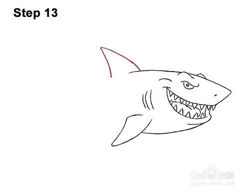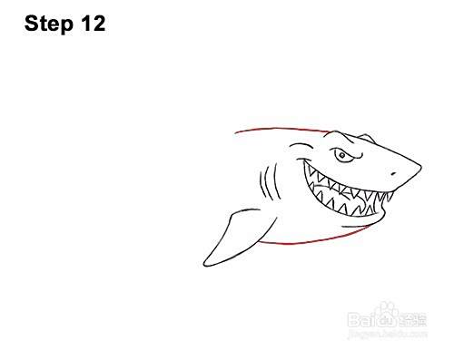 第12步:在眼睛的左侧,画出一条长而弯曲的水平线作为头顶的延续。现在添加一条很长的曲线,将卡通鲨鱼的下唇连接到头部下部的胸鳍。