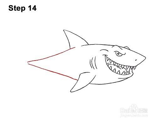 第14步:在背鳍的左侧,为鲨鱼身体的后半部分画一条长斜线。在连接到胸鳍的下方添加另一条倾斜线。线不应该在左侧。最终的结果应该类似于长小于号(<)。如果你愿意,你可以使这个形状更长。