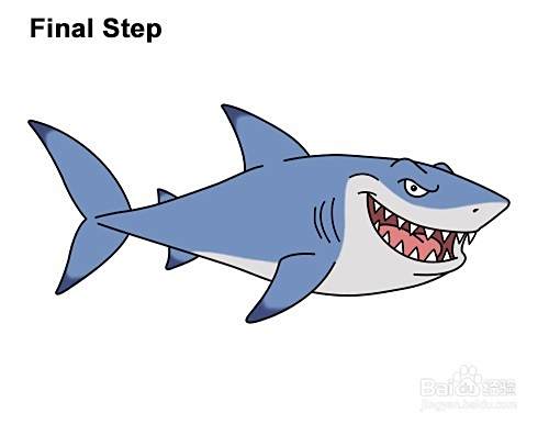 最后一步:使用彩色铅笔,记号笔甚至蜡笔为你的卡通鲨鱼绘画颜色!首先使用浅蓝色勾勒出分色。然后将该线上方的所有颜色染成淡蓝色。太阳穴也使用浅蓝色。在每个翅片的尖端添加一点深蓝色或黑色。在身体的下面使用浅灰色。你可以使用普通的灰色,但不要太用力推铅笔。将鲨鱼嘴唇的内部涂成深红色,舌头为粉红色。不要忘记暂停视频以自己的速度绘制。
