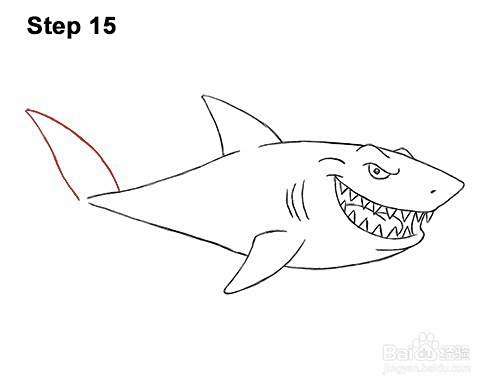 第15步:以背鳍的方式画出鲨鱼尾巴的顶部。从一条长对角线开始。然后将尾部的左边缘添加为长而弯曲的垂直线。这种形状应该比背鳍更长更薄。