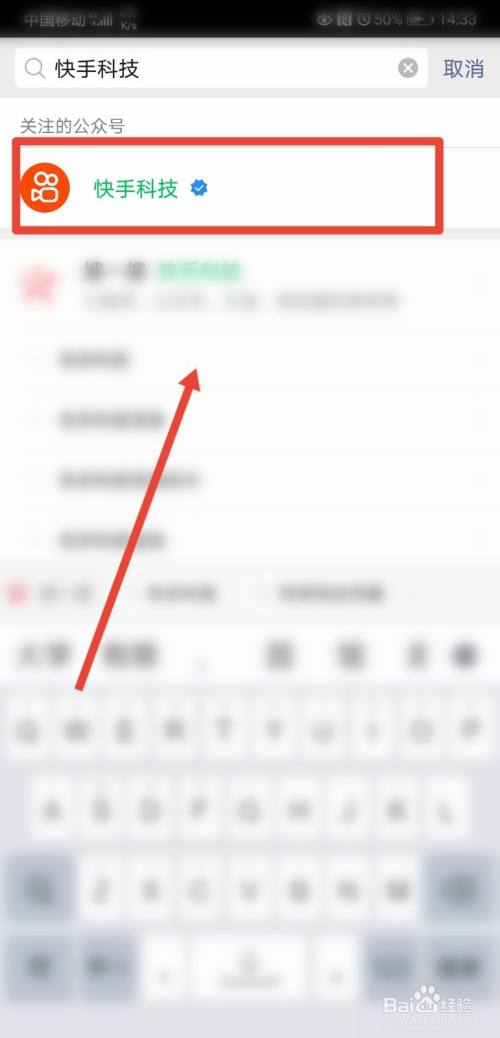 然后在点击搜索“快手科技”公众号,点击关注并打开;