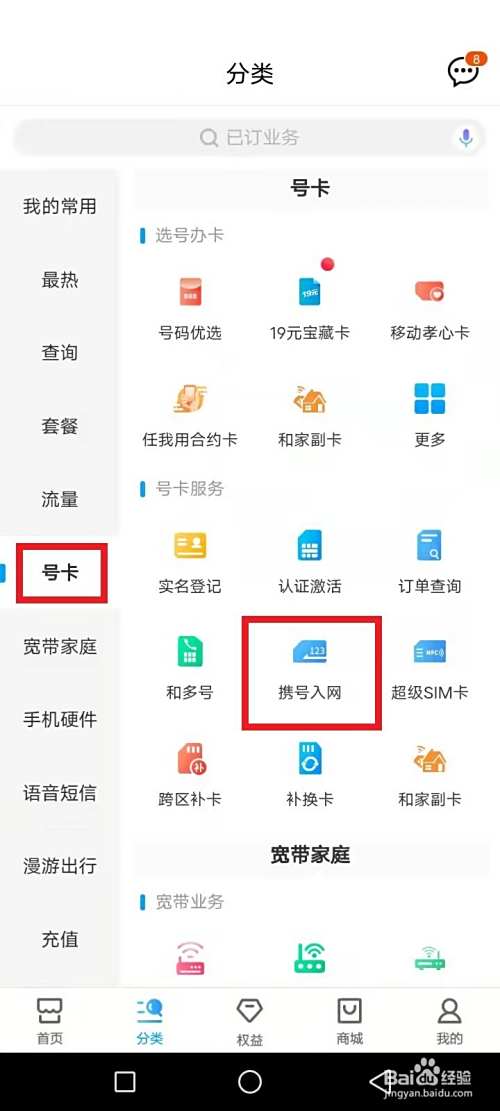 手机打开中国移动软件,查询办理号卡业务,选择携号入网项目,输入需要转网的号码提交申请订单。
