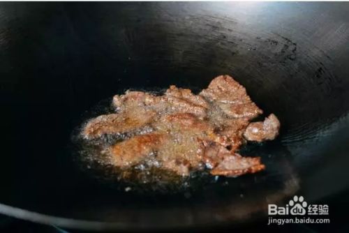 2.炒菜锅内放入三勺油,油热时,把腌制好的牛肉逐片放进去,等一面变色时,反煎另一面