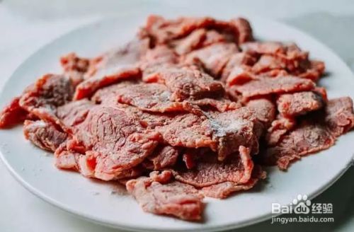 1.牛肉切成均匀的薄片,放到碗中,加入油,盐,酱油,胡椒粉,和和好的玉米淀粉,腌1小时