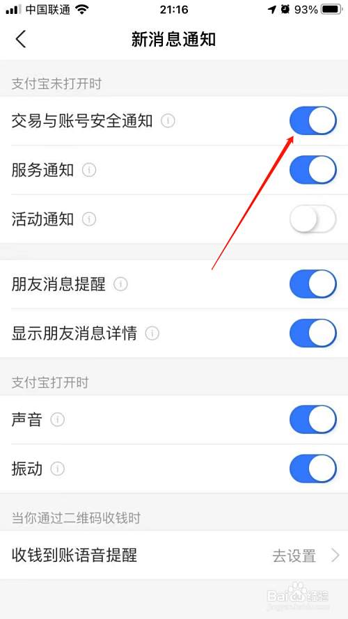 在新消息通知页面中,将交易与账号安全通知选项关闭即可。