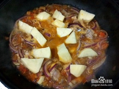 所有食材翻炒均匀后,往锅中倒水,没过食材即可,大火煮开。煮开后加入土豆,转小火煮15至20分钟后,就可以起锅了。不喜欢汤汁多的,可以开大火收汁。
