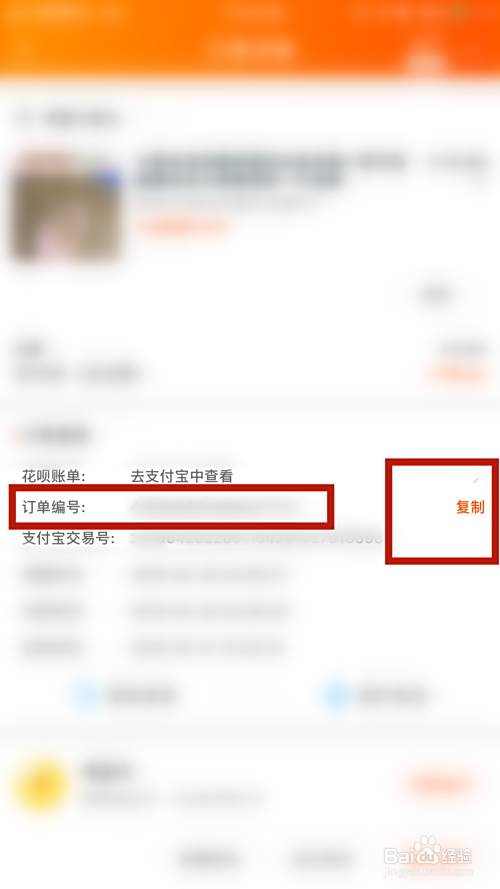 然后找到【订单编号】,然后在订单编号的右边有【复制】按钮,点击复制订单编号,方便到时候客服叫你给他订单号