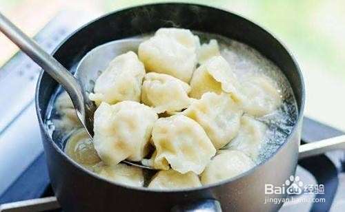 锅内烧水,加入少许食盐,水开下入饺子。用勺子沿锅边搅拌,这样可以不粘锅。盖上锅盖煮3分钟后,点入凉水再次烧开,重复3次之后,看到饺子鼓起即可捞出食用。