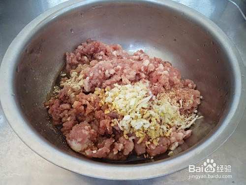 选取羊后腿肉绞成馅。加入葱姜末、料酒、生抽、食盐、鸡精,按照一个方向搅匀上劲,并将泡好的花椒水少量多次的打入羊肉馅中,这样可以去除羊肉的腥膻味,使羊肉更嫩。花椒水打入之后,搅匀上劲,加入香油搅拌均匀备用。