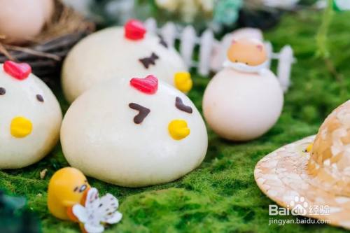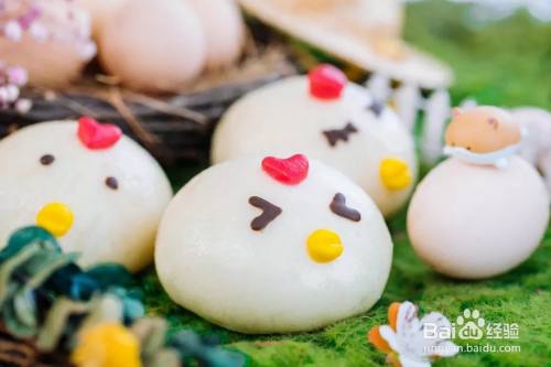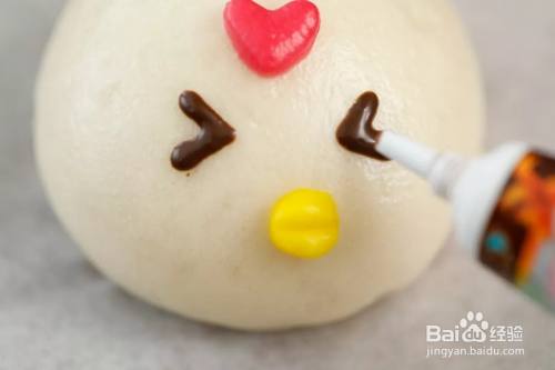 将鸡冠和嘴巴摆到相应的位置。全部做好之后,放入蒸屉里,注意保持距离,静置20分钟左右。然后烧水,烧开之后改成中火,放到锅上蒸15分钟左右,蒸好之后不要掀盖子,静置5分钟左右再掀开。用巧克力笔画上各种表情即可。