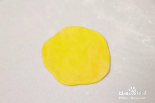 取少许的白色面团加适量的黄色可食用色素,揉成光滑的黄色面团,擀成薄片。