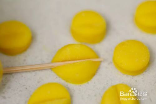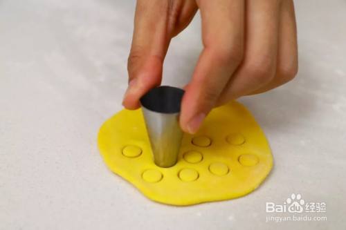 用小号裱花嘴切出圆形的面皮。再用牙签在中间位置压一下,做成黄色小鸡的嘴巴。