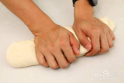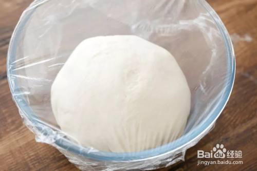 盖上保鲜膜,放入温暖处进行发酵,大约40分钟。发酵至原来体积的2倍大就可以了。发酵好之后取出,在撒了干粉的面板上不断按揉排气。
