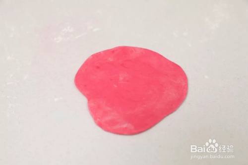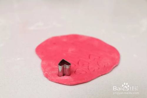 然后分出来12个60g的小面团,揉圆。取剩下少许的白色面团加适量的红色可食用色素,揉成光滑的红色面团,擀成薄片。再用模具盖出心形的鸡冠。