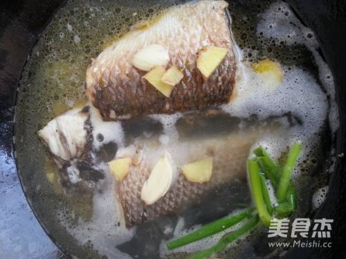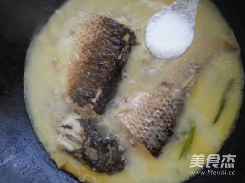 6汤汁慢慢变成了乳白色,当汤汁渐少时,加入盐调味,继续收汤汁,这个时候要注意看着锅,因为很容易粘锅,收到合适的汤汁时,关火。