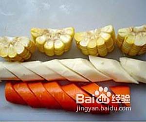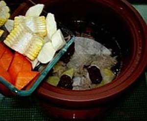 加入山药、胡萝卜、玉米再慢火煲2小时就好了,食用的时候加入少量盐、鸡精即可。