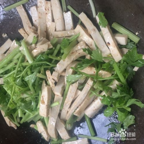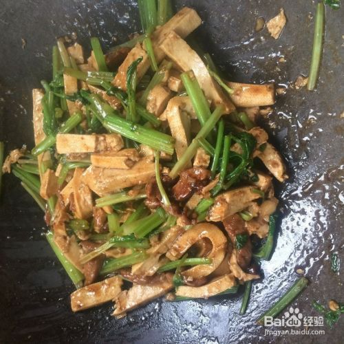 再下芹菜翻炒,这时开大火,继续翻炒。
