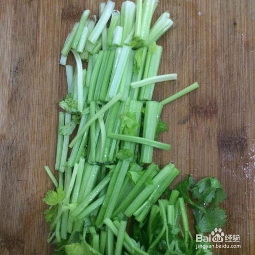 芹菜洗干净,泡半小时后再冲洗一下沥干切断待用。