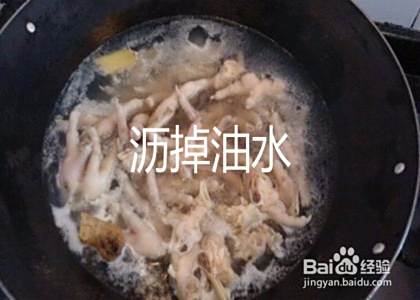 沥掉油水。边煮鸡爪的时候,边把锅里的油水沥掉,这些沥出来的油水倒掉。