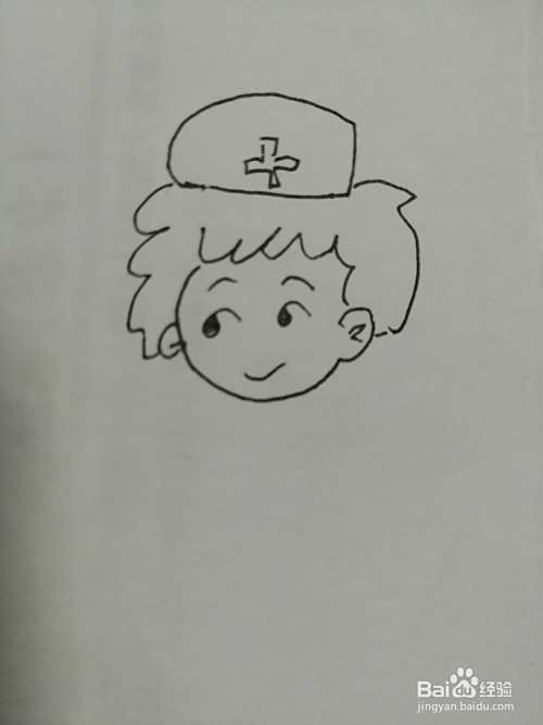 第四步,接着继续画出简笔画小护士的眉毛眼睛和微笑的小嘴巴。
