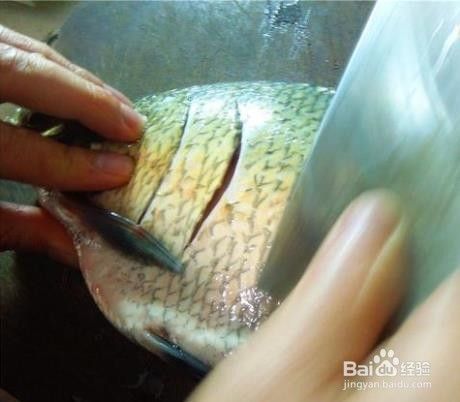 2、在鱼身上隔2厘米斜割一刀,这样易熟也易入味。