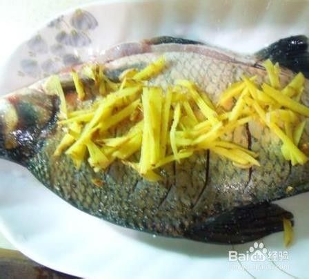 4、找一个鱼盘,在底部垫上几片姜片,可以透气,利于水蒸汽进入,鱼肚子里再塞几片姜片,有利于去腥,最上面盖些姜丝,好看一点。